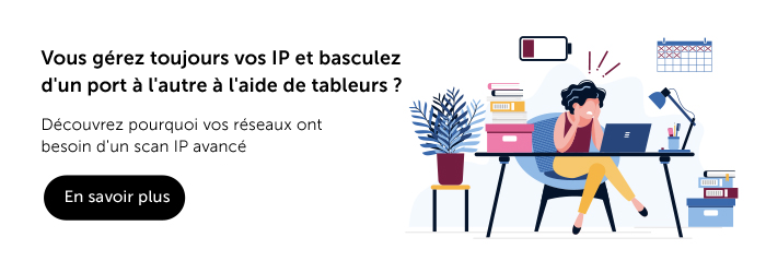 La façon la plus courante d'effectuer une analyse IP consiste à utiliser les commandes natives prises en charge par le système d'exploitation que vous utilisez. Si vous êtes un administrateur qui gère un petit réseau avec une poignée d'IP, les commandes natives comme ipconfig et ping peuvent vous aider à analyser les IP et à suivre votre espace d'adressage réseau. Cependant, l'application de cette technique aux réseaux à grande échelle ou d'entreprise est quasiment impossible. Pourquoi ? Les réseaux à grande échelle comportent de multiples sous-réseaux, effectuent des attributions dynamiques d'IP, prennent en charge les politiques BYOD et s'adaptent continuellement aux besoins de calcul. Toutes ces caractéristiques excluent la possibilité d'analyser manuellement votre réseau à l'aide de commandes natives.