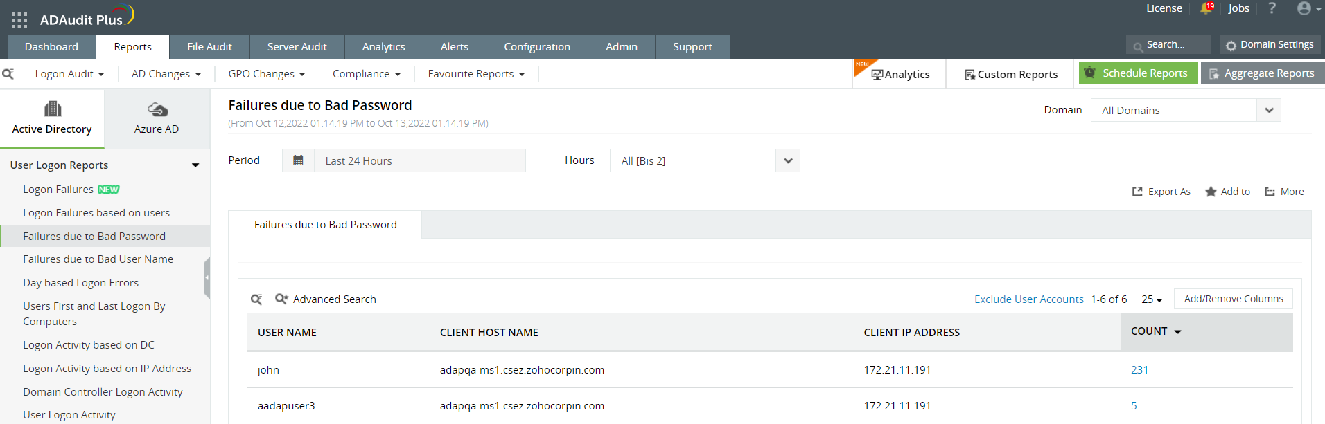 Dans ce rapport, après avoir cliqué sur Count, le rapport affichera tous les événements d'échec de connexion pour lesquels la Failure Reason est Bad Password, ainsi que d'autres attributs comme User Name, Client IP address, Client Host Name, Domain Controller et Logon Time.