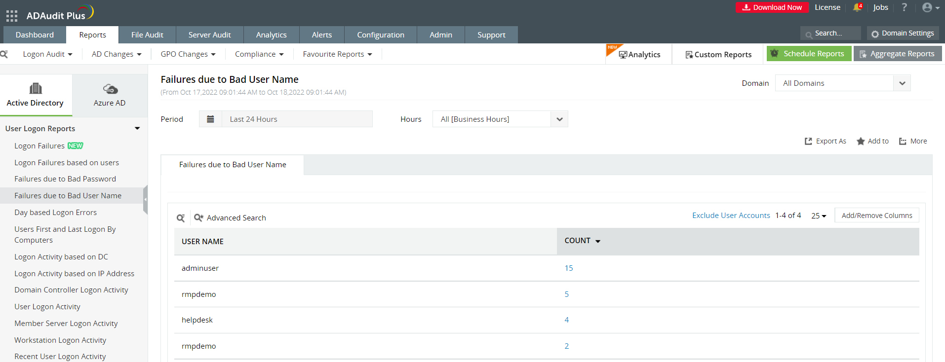 Dans ce rapport, si vous cliquez sur Count, le rapport affichera tous les événements d'échec de connexion pour lesquels la Failure Reason est Bad User Name, ainsi que d'autres attributs tels que User Name, Client IP address, Client Host Name, Domain Controller et Logon Time.