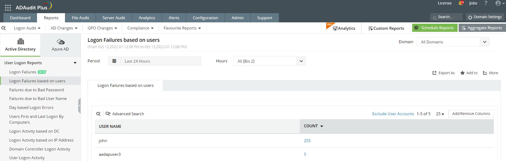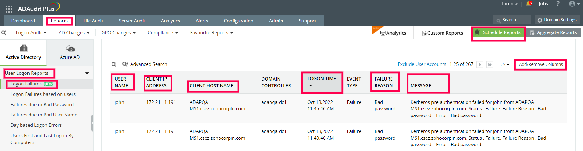 Figure 1. Cette capture d'écran montre le rapport Logon Failures dans ADAudit Plus.