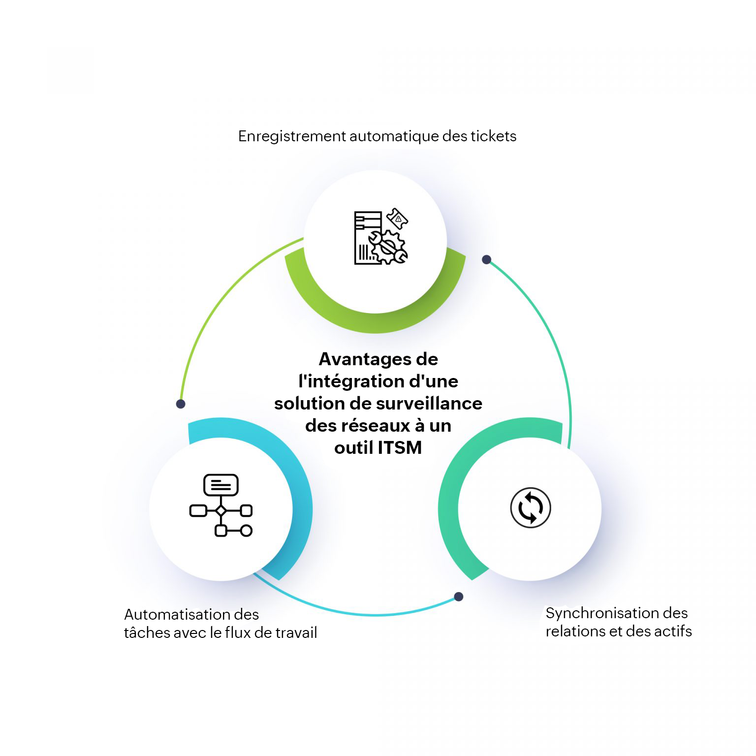 En intégrant une solution de surveillance de réseau à un outil ITSM, les administrateurs de réseau peuvent synchroniser les périphériques ainsi que les relations directement avec l'outil ITSM. Cette synchronisation permet une meilleure visualisation et aide les administrateurs réseau à analyser l'impact et la cause première. Elle permet également aux administrateurs de réseau d'obtenir une image claire de leur réseau.
