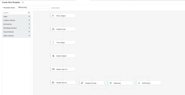 Dans la plupart des entreprises, la suppression complète d'un compte utilisateur et des autorisations d'accès associées prend des semaines, voire des mois, après le dernier jour d'un employé. Avec les modèles d'orchestration d'ADManager Plus, les admins peuvent définir une série de tâches d'offboarding à effectuer selon la stratégie de l'entreprise, comme le déplacement du compte vers une autre OU, la désactivation du compte pour une durée déterminée, la suppression de l'AD, Exchange, Microsoft 365, Google Workspace, la création de tickets pour révoquer les autorisations d'accès dans les outils ITSM et la notification de la suppression du compte aux parties prenantes telles que les admins IT et les managers.